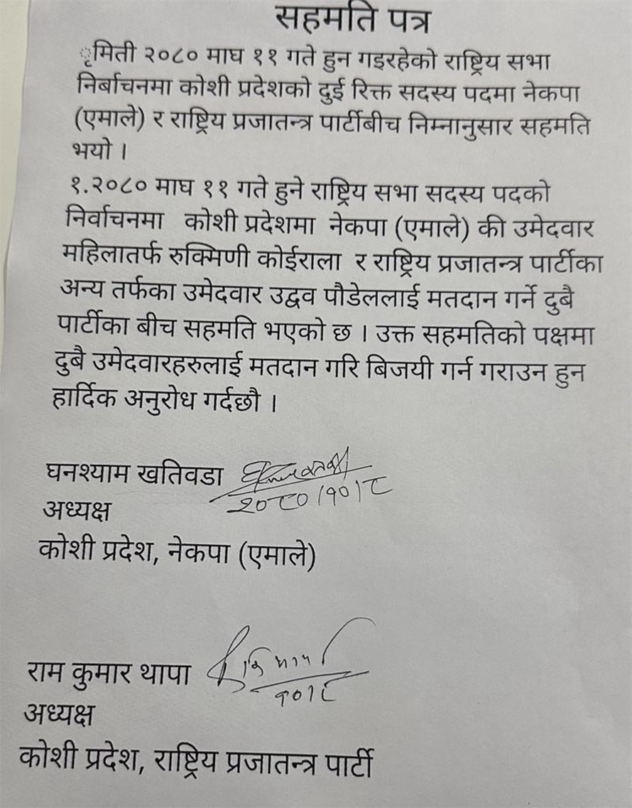 दुई दलका कोशी प्रदेश अध्यक्षले गरेको लिखित सहमति अनुसार ११ माघमा हुने राष्ट्रिय सभा निर्वाचनमा कोशी प्रदेशको अन्यतर्फ एमालेले आफ्नो उम्मेदवार परशुराम अधिकारीको साटो राप्रपाका उद्धव पौडेललाई मत दिनेछ भने राप्रपाले महिलातर्फ एमालेकी रुक्मिणी कोइरालालाई मत दिनेछ ।