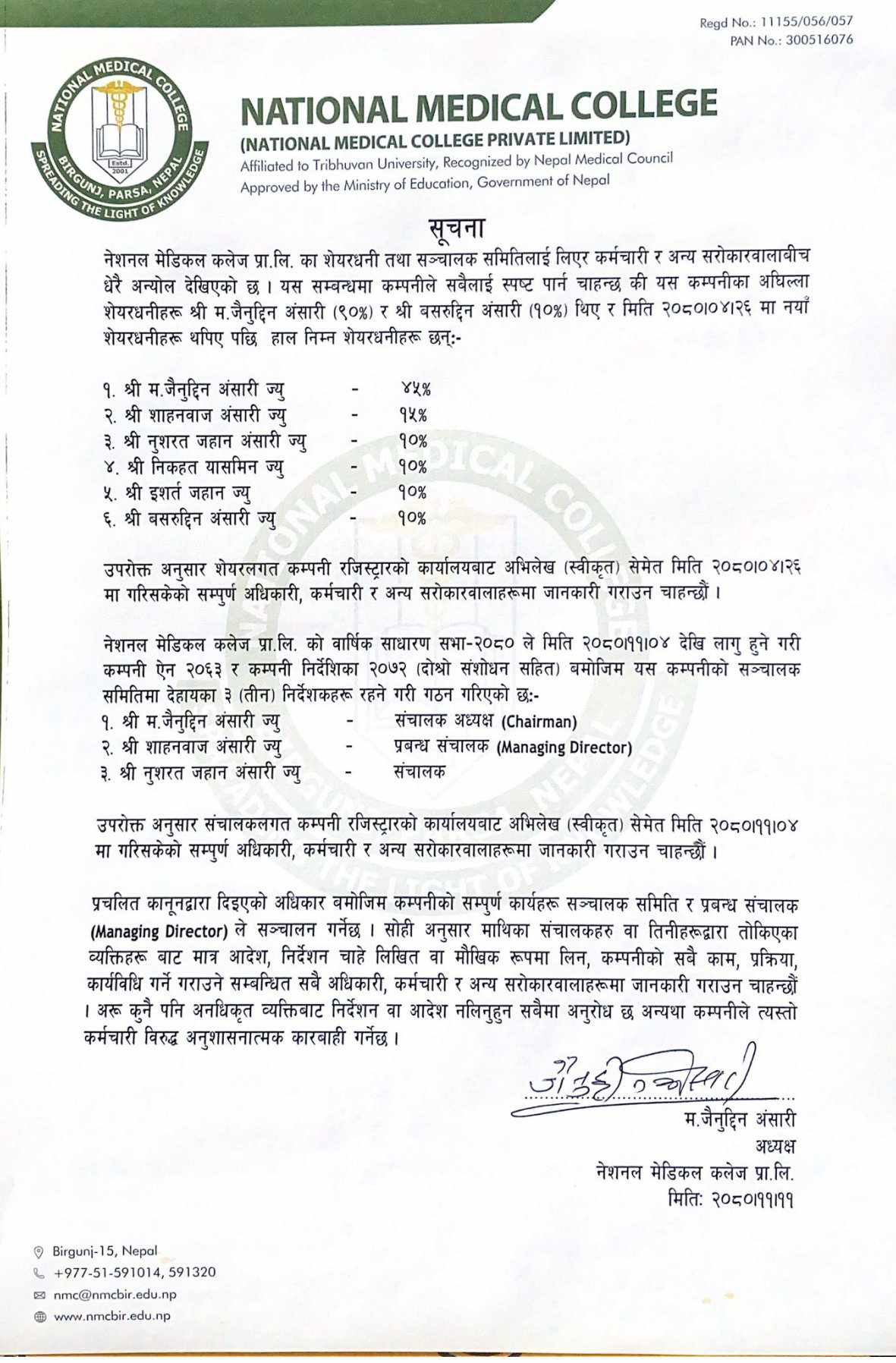 फागुन ४ गते बसेको सञ्चालक समितिको बैठकले शाहनवाज अन्सारीलाई प्रबन्ध निर्देशकमा नियुक्त गरेको कलेजले जनाएको छ । अन्सारी यसअघि कलेजको निर्देशक भएर कार्यरत थिए ।