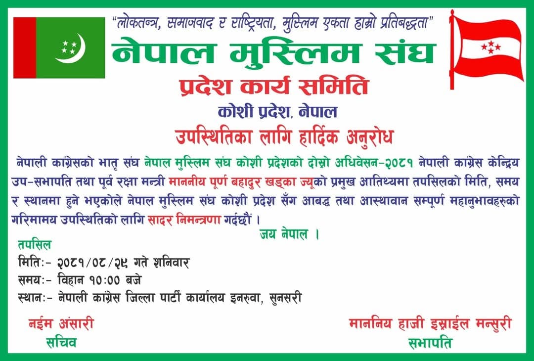 मुस्लिम संघ कोशी प्रदेश कार्यसमितिले मंसिर २३ गते बसेको बैठकले नेपाली काँग्रेसका केन्द्रीय उप-सभापति तथा पुर्व रक्षा मन्त्री पूर्ण बहादुर खड्काको प्रमुख आतिथ्यतमा अधिवेशन गर्ने निर्णय गरेको मुस्लिम संघका कोशी प्रदेशका सचिव नईम अन्सारीले जानकारी दिएको हो ।