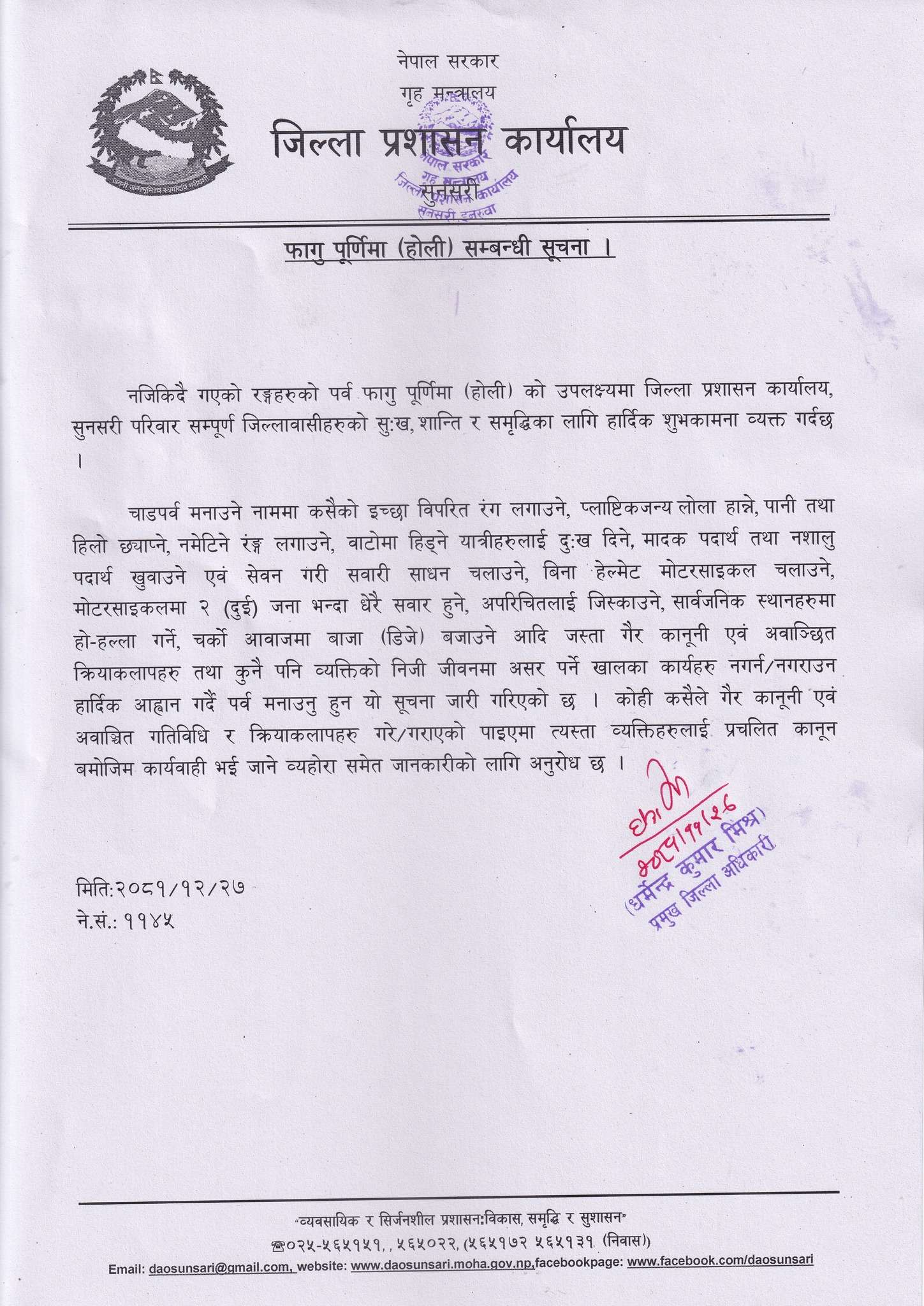 प्रमुख जिल्ला अधिकारी धर्मेन्द्र कुमार मिश्रद्वारा जारी सूचनाअनुसार कसैको इच्छा विपरीत जबरजस्ती रङ्ग नलगाउन, नमेटिने रङ्गको प्रयोग नगर्न तथा सार्वजनिक स्थानमा अमर्यादित गतिविधि नगर्न आग्रह गरिएको छ ।