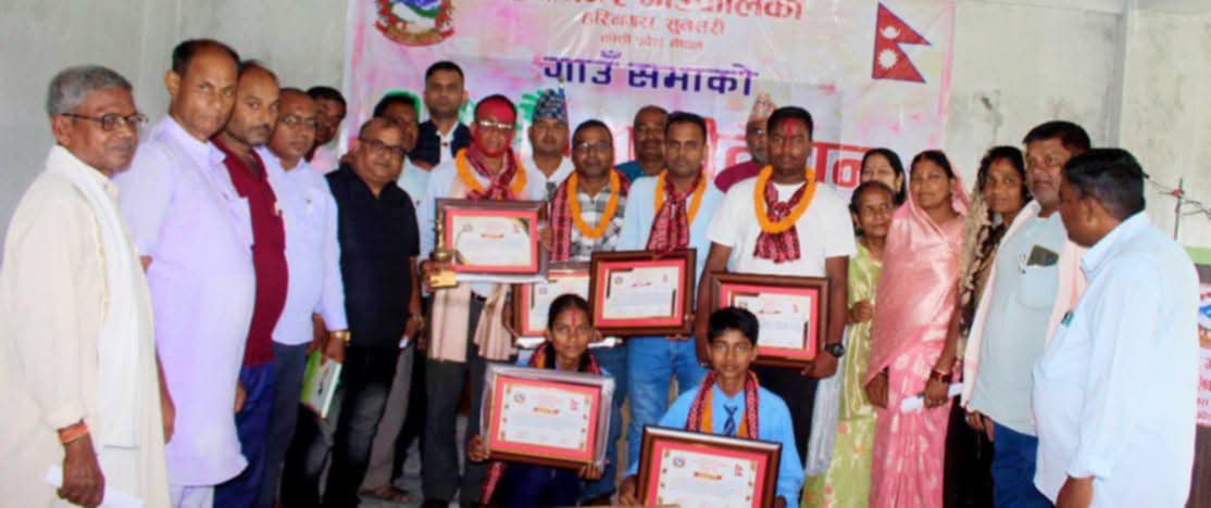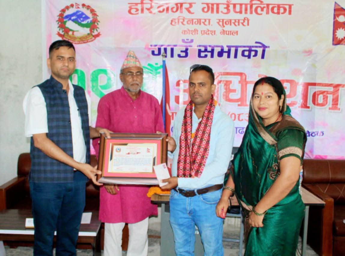भुटाहा,। सुनसरीको हरिनगर गाउँपालिका सुनसरीले १९ औं गाउँसभा अधिवेशनमा ३ पत्रकार २ विद्यार्थी १ शिक्षकसहित ६ जना सम्मानित गरेको छ।पालिकाले १९ औं गाउँसभा अधिवेशन सम्पन्नको अवसरमा मंगलबार स्थानीय पत्रकारहरुलाई सम्मानित गरेको हो ।