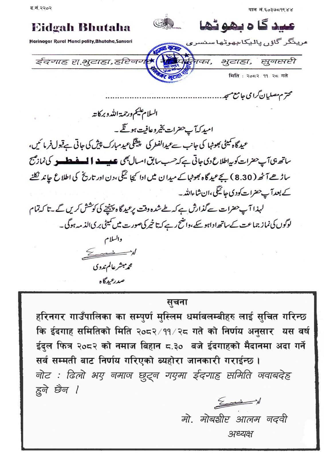 यस वर्ष भुटाहा ईदगाहमा ईदउलफित्र (ईद) को नमाज शनिबार बिहान साढे आठ बजे हुने भुटाहा ईदगाह कार्यसमितिले जानकारी दिएको हो।